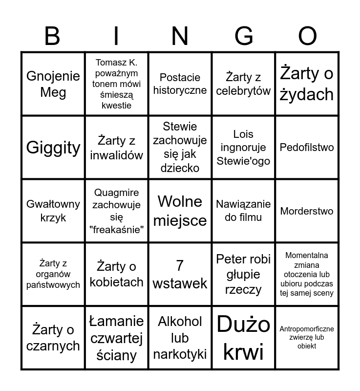 This bingo card has a free space and 24 words: Żarty o kobietach, Łamanie czwartej ściany, Stewie zachowuje się jak dziecko, Żarty o czarnych, Żarty o żydach, Gnojenie Meg, Giggity, Tomasz K. poważnym tonem mówi śmieszą kwestie, Nawiązanie do filmu, 7 wstawek, Lois ingnoruje Stewie'ogo, Gwałtowny krzyk, Peter robi głupie rzeczy, Momentalna zmiana otoczenia lub ubioru podczas tej samej sceny, Żarty z inwalidów, Dużo krwi, Morderstwo, Postacie historyczne, Pedofilstwo, Quagmire zachowuje się "freakaśnie", Antropomorficzne zwierzę lub obiekt, Żarty z organów państwowych, Żarty z celebrytów and Alkohol lub narkotyki.