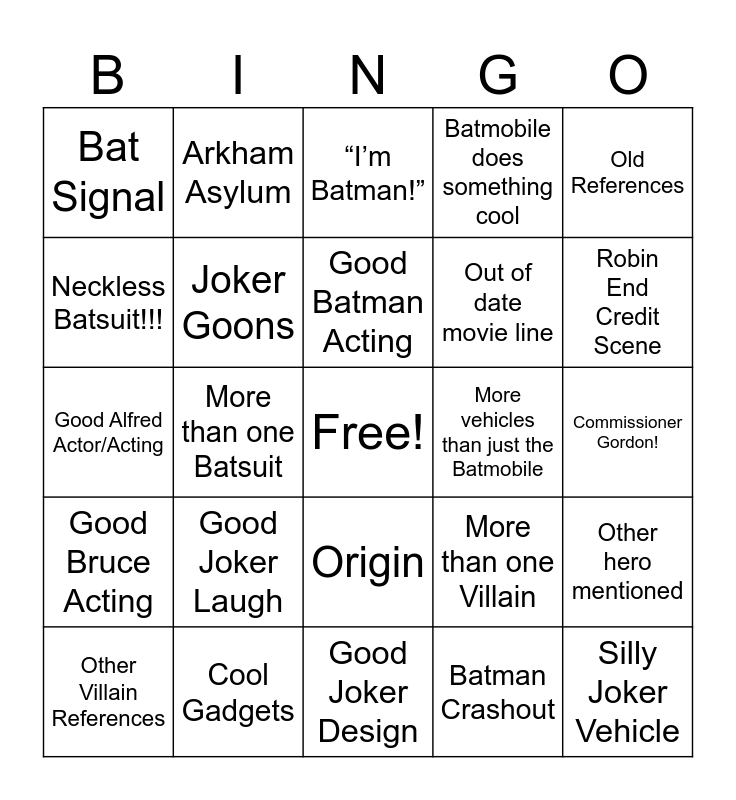 This bingo card has a free space and 24 words: Good Joker Laugh, Cool Gadgets, Good Batman Acting, Other Villain References, Old References, Bat Signal, Neckless Batsuit!!!, Arkham Asylum, More vehicles than just the Batmobile, Origin, Out of date movie line, Good Alfred Actor/Acting, More than one Villain, Other hero mentioned, Joker Goons, Batman Crashout, Commissioner Gordon!, “I’m Batman!”, Robin End Credit Scene, More than one Batsuit, Silly Joker Vehicle, Good Bruce Acting, Batmobile does something cool and Good Joker Design.