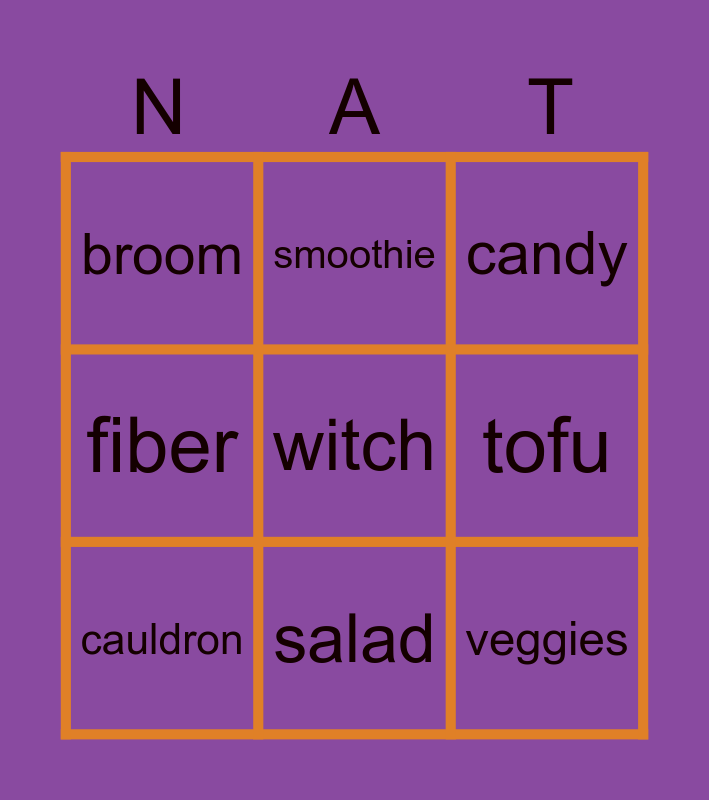 This bingo card has 31 words: Free!, bat, bones, boo, broom, candy, cauldron, costume, ghost, goblin, jack-o-lantern, mask, monster, moon, mummy, pumpkin, skeleton, spider, spooky, vampire, witch, plant-based, protein, smoothie, veggies, tofu, fiber, vitamins, wellness, salad and avocado.
