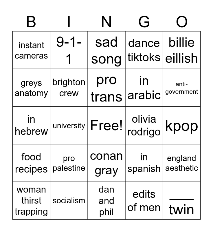 This bingo card has a free space and 24 words: pro palestine, socialism, pro trans, woman thirst trapping, billie eillish, instant cameras, greys anatomy, 9-1-1, olivia rodrigo, conan gray, in arabic, in hebrew, in spanish, england aesthetic, brighton crew, edits of men, kpop, sad song, anti-government, university, ___ twin, food recipes, dance tiktoks and dan and phil.
