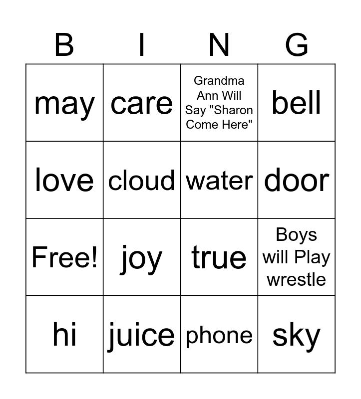 This bingo card has 20 words: Boys will Play wrestle, Sharon will call someone by the wrong name, Grandma Ann Will Say "Sharon Come Here", Grandma Ann Will, hi, love, juice, may, Free!, care, joy, true, cloud, sky, water, noise, door, bell, phone and nine.