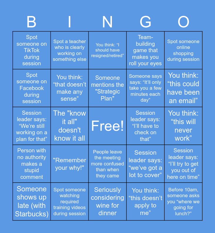 This bingo card has a free space and 24 words: "Remember your why!", Spot someone watching required training videos during session, Someone mentions the "Strategic Plan", Someone shows up late (with Starbucks), Spot someone online shopping during session, Spot someone on TikTok during session, Spot someone on Facebook during session, Spot a teacher who is clearly working on something else, Session leader says: “I’ll have to check on that”, People leave the meeting more confused than when they came, Someone says says: “It’ll only take you a few minutes each day”, Session leader says: “We’re still working on a plan for that”, Session leader says: “we’ve got a lot to cover”, Session leader says: “I’ll try to get you out of here on time”, You think: “that doesn’t make any sense”, You think: “this doesn’t apply to me”, You think: “this will never work”, You think: “I should have resigned/retired”, You think: “this could have been an email”, The "know it all" doesn't know it all, Before 10am, someone asks you “where we going for lunch?”, Person with no authority makes a stupid comment, Team-building game that makes you roll your eyes and Seriously considering wine for dinner.