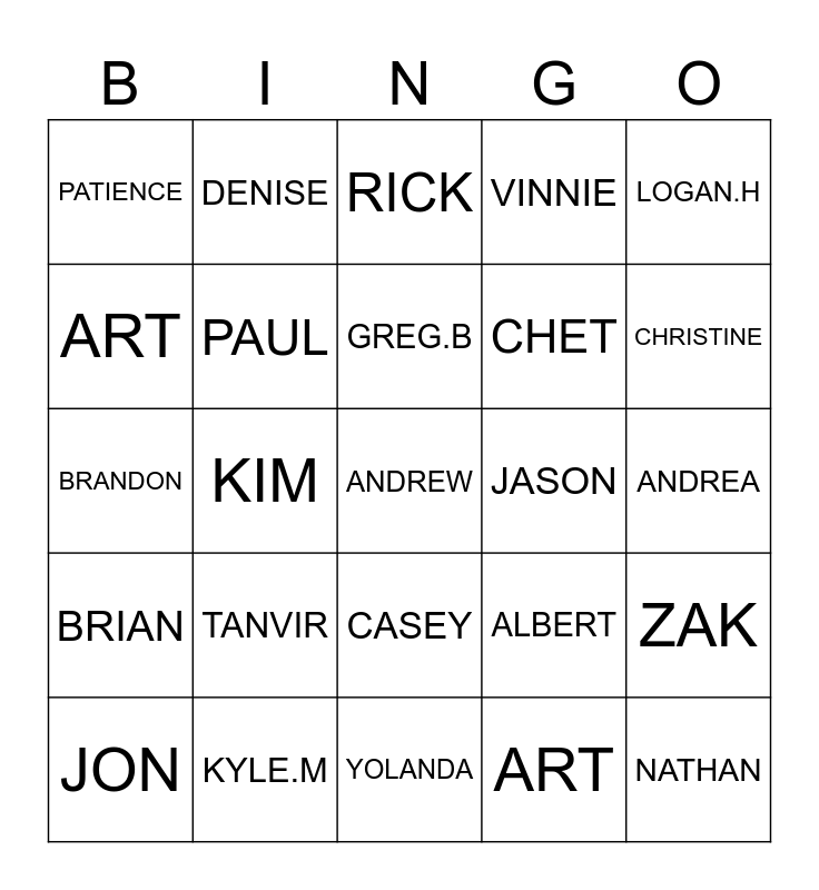 This bingo card has a free space and 25 words: TANVIR, YOLANDA, GREG.B, JON, LOGAN.H, PATIENCE, ART, DENISE, JASON, CASEY, CHET, BRANDON, ALBERT, ZAK, PAUL, EZZY, ANDREA, RICK, CHRISTINE, KIM, NATHAN, KYLE.M, BRIAN, VINNIE and ART.