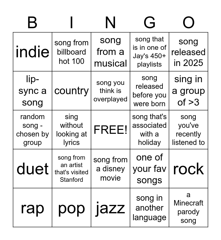 This bingo card has a free space and 24 words: song from an artist that's visited Stanford, pop, song you think is overplayed, rap, song released in 2025, indie, lip-sync a song, song from billboard hot 100, song that's associated with a holiday, song from a disney movie, song released before you were born, random song - chosen by group, one of your fav songs, rock, country, song in another language, song you've recently listened to, song from a musical, sing in a group of >3, sing without looking at lyrics, a Minecraft parody song, duet, song that is in one of Jay's 450+ playlists and jazz.