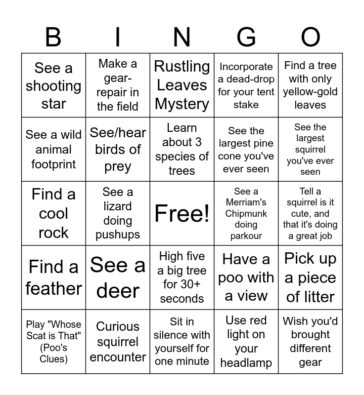 This bingo card has a free space and 39 words: Find some scat, Pack the 10 essentials, See the Big Dipper, See/hear birds of prey, Play "Whose Scat is That" (Poo's Clues), High five a big tree for 30+ seconds, Learn about 3 species of trees, Forget a piece of gear, Find a tree with only yellow-gold leaves, Find a feather, See a lizard doing pushups, Incorporate a dead-drop for your tent stake, Wish you'd brought different gear, Tell a squirrel is it cute, and that it's doing a great job, See a Merriam's Chipmunk doing parkour, See a deer, Nick talks about fungi for 5+ minutes, See a shooting star, See sunrise, Have a poo with a view, See a wild animal footprint, Sit in silence with yourself for one minute, See the largest pine cone you've ever seen, See the largest squirrel you've ever seen, Find the perfect crimson leaf, Submit your perfect acorn to the Perfect Acorn contest, See the PCT logo on a 4x4 post, Get your bear-hang on the first try, Turn off your phone, Make a gear-repair in the field, Say "hello" to a passing hiker (not in our group), Catch the Beautiful and Scenic Hemet vista, Rustling Leaves Mystery, Curious squirrel encounter, Use red light on your headlamp, Find your location on your trail map, Pick up a piece of litter, Find a cool rock and Drink some electrolytes.