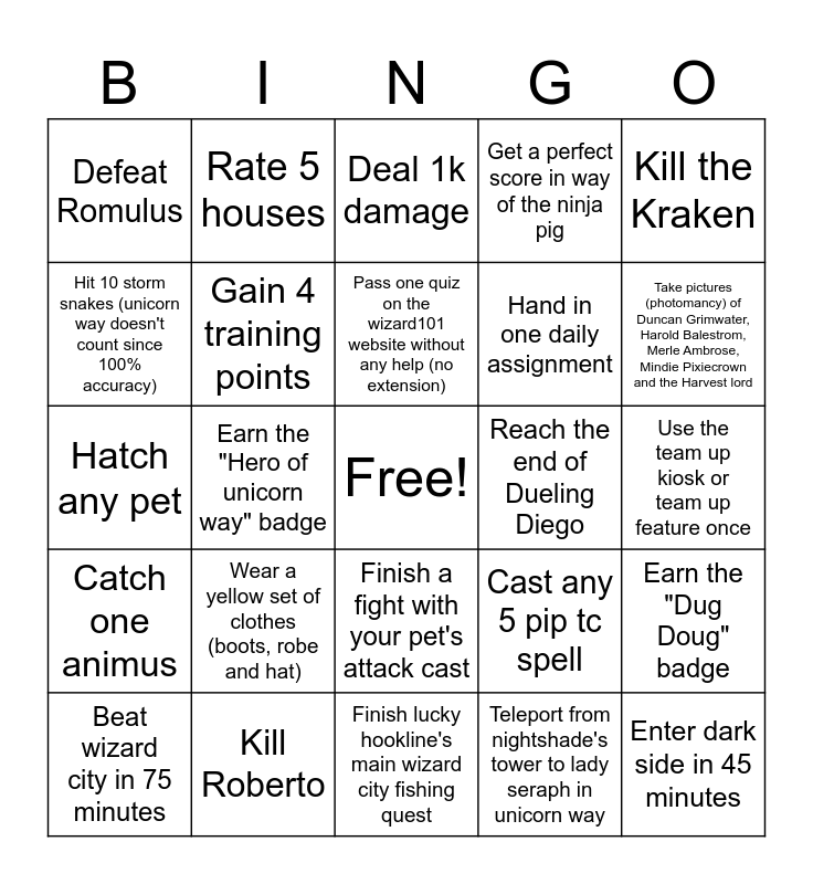 This bingo card has a free space and 43 words: Kill Malistaire with a dark sprite, Enter dark side in 45 minutes, Learn treant from Moolinda Wu (or killer snowman if you're life), Beat wizard city in 75 minutes, Buy 10 of any "mutate" treasure cards at once, Teleport from nightshade's tower to lady seraph in unicorn way, Deal 1k damage, Use every school's 1 pip attack (tc allowed), Kill the Kraken, Kill Roberto, Get a perfect score in way of the ninja pig, Reach the end of Dueling Diego, Finish a fight with your pet's attack cast, Wear a yellow set of clothes (boots, robe and hat), Kill Alicane swiftarrow with a fire spell and no prism (only last hit, tc allowed), Finish lucky hookline's main wizard city fishing quest, Kill prince gobstone, Hatch any pet, Run 10 laps around the commons and stay sane, Take pictures (photomancy) of Duncan Grimwater, Harold Balestrom, Merle Ambrose, Mindie Pixiecrown and the Harvest lord, Rate 5 houses, Finish one spell quest, Beat the tutorial, Defeat Romulus, Defeat Malweena Smite, Use the team up kiosk or team up feature once, Have 7 pips at once, Use the pixie spell twice in battle, Cast any 5 pip tc spell, Catch one animus, Finish the golem tower in golem court, Earn the "Dug Doug" badge, Use at least 4 of the following in one attack: Blade, trap, feint (treasure cards allowed), Earn the "Hero of unicorn way" badge, Transform into any creature from the shop (can be purchasable with gold), Read all of the wizard city lore books, Find all of the smiths, Pass one quiz on the wizard101 website without any help (no extension), Hit 10 storm snakes (unicorn way doesn't count since 100% accuracy), Hand in one daily assignment, Learn 6 spells, Gain 4 training points and Fizzle three times.