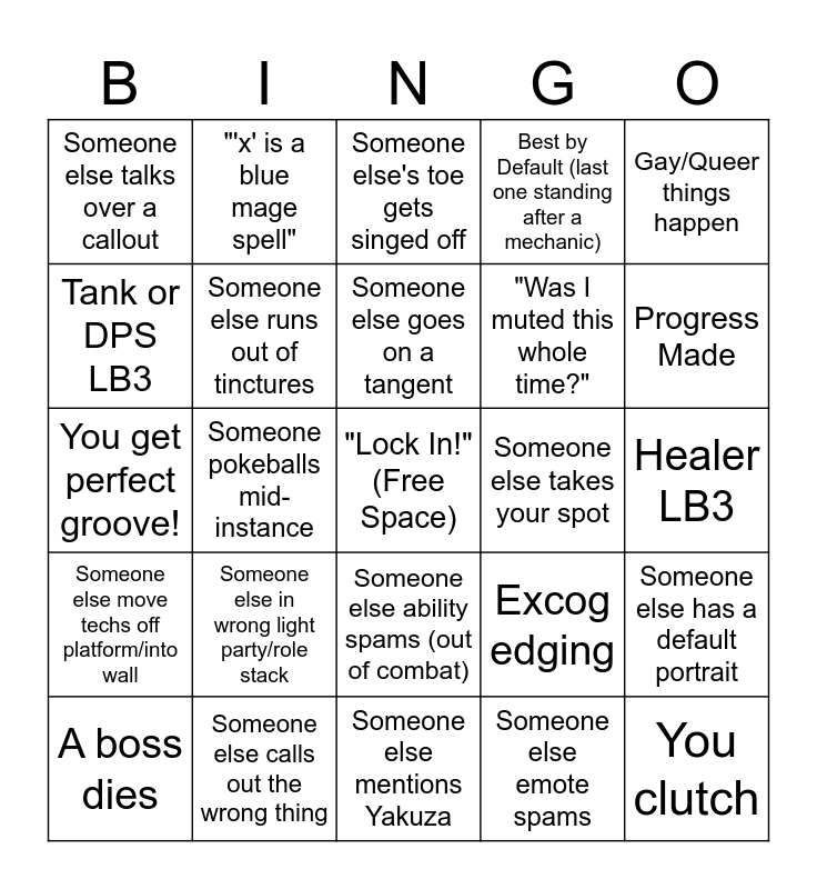 This bingo card has a free space and 38 words: We start on time, Someone else's gear breaks, Someone else forgets food buff for a pull, Someone else runs out of tinctures, Someone else has a default portrait, Someone else in wrong light party/role stack, Someone else goes on a tangent, Degeneracy Happens, Gay/Queer things happen, "Was I muted this whole time?", Someone pokeballs mid-instance, Best by Default (last one standing after a mechanic), You clutch, Healer LB3, Tank or DPS LB3, Someone else move techs off platform/into wall, Someone else kills you, Someone else's toe gets singed off, Someone else accidentally or early pulls, Someone else takes your spot, Someone else talks over a callout, Someone else calls out the wrong thing, Progress Made, A boss dies, Someone else mentions Majong, Someone else mentions Yakuza, Someone else mentions Sonic (Including music), Someone else mentions furry things, Someone else mentions Deltarune, Someone runs around in circles, Someone else crafts during break, Someone else ability spams (out of combat), Someone else emote spams, "'x' is a blue mage spell", Primal Rend demons, Excog edging, You get perfect groove! and Everyone gets perfect groove!.