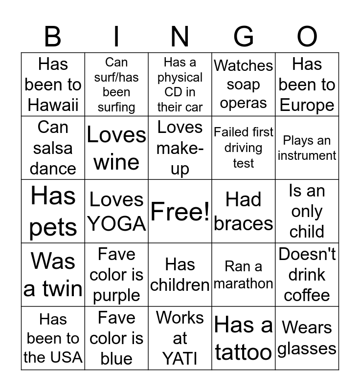 This bingo card has a free space and 24 words: Fave color is purple, Fave color is blue, Loves make-up, Has been to the USA, Has been to Europe, Has been to Hawaii, Can salsa dance, Can surf/has been surfing, Had braces, Has children, Failed first driving test, Has pets, Ran a marathon, Doesn't drink coffee, Loves wine, Has a tattoo, Is an only child, Has a physical CD in their car, Plays an instrument, Loves YOGA, Wears glasses, Was a twin, Watches soap operas and Works at YATI.