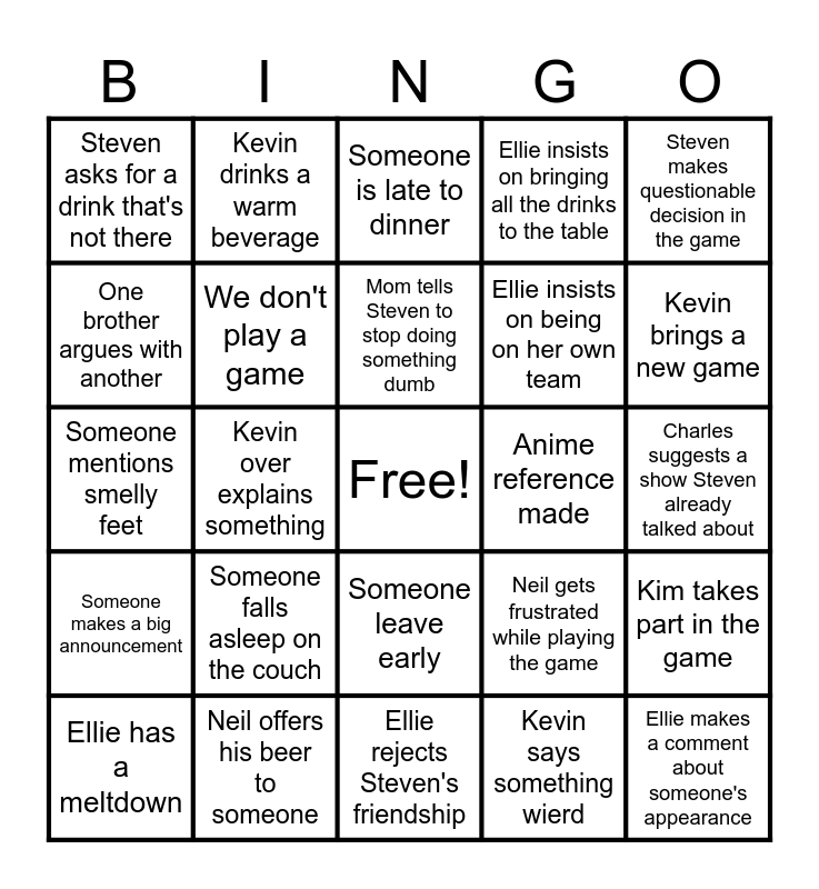 This bingo card has a free space and 24 words: Ellie has a meltdown, Someone falls asleep on the couch, Mom tells Steven to stop doing something dumb, Kevin says something wierd, Steven makes questionable decision in the game, Steven asks for a drink that's not there, Kevin drinks a warm beverage, Someone is late to dinner, Anime reference made, Charles suggests a show Steven already talked about, Someone mentions smelly feet, We don't play a game, Neil gets frustrated while playing the game, Kim takes part in the game, One brother argues with another, Neil offers his beer to someone, Ellie rejects Steven's friendship, Ellie insists on bringing all the drinks to the table, Kevin brings a new game, Someone makes a big announcement, Kevin over explains something, Someone leave early, Ellie insists on being on her own team and Ellie makes a comment about someone's appearance.