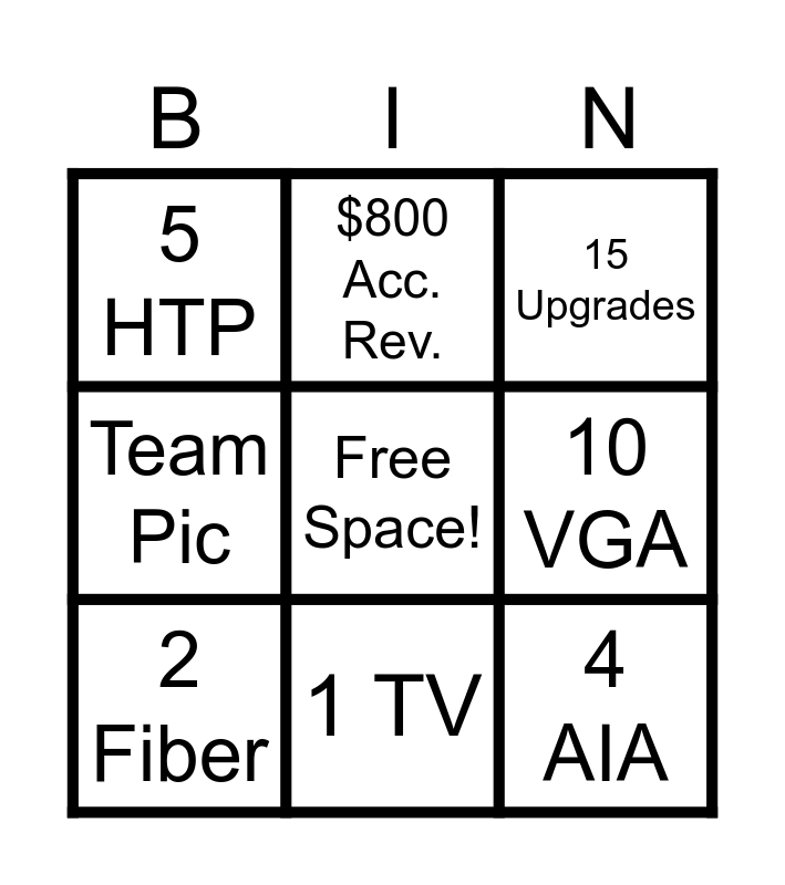 This bingo card has a free space and 8 words: 10 VGA, 15 Upgrades, $800 Acc. Rev., 2 Fiber, 5 HTP, 4 AIA, Team Pic and 1 TV.