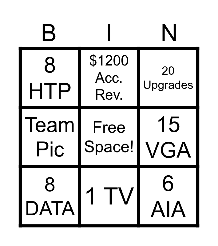 This bingo card has a free space and 8 words: 15 VGA, 20 Upgrades, $1200 Acc. Rev., 8 DATA, 8 HTP, 6 AIA, Team Pic and 1 TV.