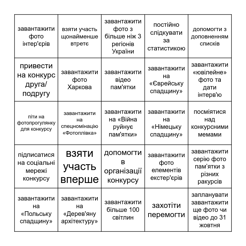 This bingo card has a free space and 25 words: взяти участь вперше, завантажити більше 100 світлин, завантажити відео пам'ятки, завантажити на «Польську спадщину», допомогти з доповненням списків, завантажити фото інтер'єрів, привести на конкурс друга/подругу, взяти участь щонайменше втретє, завантажити на «Німецьку спадщину», допомогти в організації конкурсу, завантажити на «Єврейську спадщину», піти на фотопрогулянку для конкурсу, завантажити фото елементів екстер'єрів, завантажити серію фото пам’ятки з різних ракурсів, завантажити фото Харкова, дізнатися щось нове про конкурс, посміятися над конкурсними мемами, завантажити фото з більше ніж 3 регіонів України, завантажити «ювілейне» фото та дати інтерв'ю, завантажити на спецномінацію «Фотоплівка», запланувати завантажити ще фото чи відео до 31 жовтня, завантажити на «Дерев'яну архітектуру», підписатися на соціальні мережі конкурсу, постійно слідкувати за статистикою and захотіти перемогти.