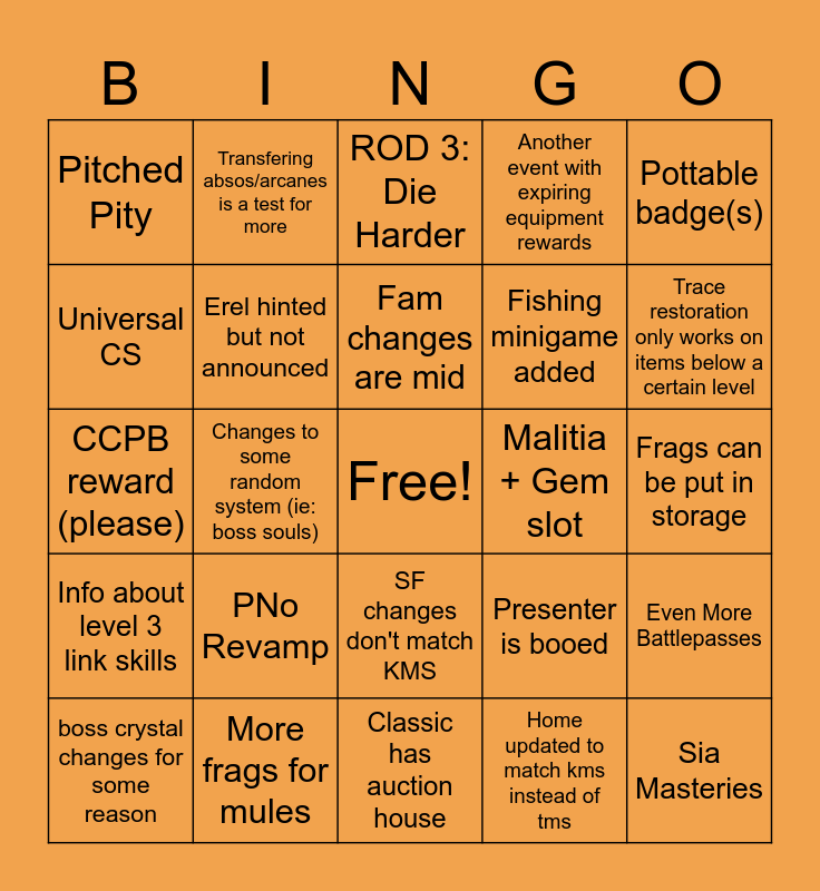 This bingo card has a free space and 24 words: PNo Revamp, More frags for mules, Fam changes are mid, boss crystal changes for some reason, Pottable badge(s), Pitched Pity, Universal CS, Transfering absos/arcanes is a test for more, Malitia + Gem slot, SF changes don't match KMS, Fishing minigame added, CCPB reward (please), Presenter is booed, Even More Battlepasses, Erel hinted but not announced, Home updated to match kms instead of tms, Frags can be put in storage, ROD 3: Die Harder, Trace restoration only works on items below a certain level, Changes to some random system (ie: boss souls), Sia Masteries, Info about level 3 link skills, Another event with expiring equipment rewards and Classic has auction house.