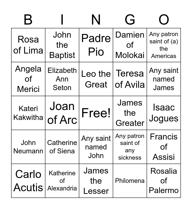 This bingo card has a free space and 24 words: Catherine of Siena, Katherine of Alexandria, Leo the Great, Carlo Acutis, Any patron saint of (a) the Americas, Rosa of Lima, Angela of Merici, John the Baptist, James the Greater, Any saint named John, Teresa of Avila, Kateri Kakwitha, Any patron saint of any sickness, Francis of Assisi, Elizabeth Ann Seton, Philomena, Isaac Jogues, Padre Pio, Any saint named James, Joan of Arc, Rosalia of Palermo, John Neumann, Damien of Molokai and James the Lesser.