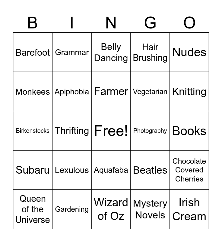 This bingo card has a free space and 27 words: Beatles, Feminism, Vegetarian, Wizard of Oz, Monkees, Belly Dancing, Grammar, Subaru, Photography, Chocolate Covered Cherries, Birkenstocks, Hair Brushing, Queen of the Universe, Gardening, Knitting, Dramatic, Apiphobia, Farmer, Lexulous, Barefoot, Books, Mystery Novels, Thrifting, Irish Cream, Aquafaba, Nudes and Cats.