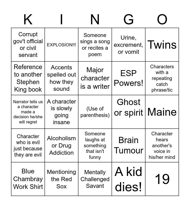 This bingo card has a free space and 24 words: Alcoholism or Drug Addiction, Mentioning the Red Sox, Major character is a writer, Blue Chambray Work Shirt, Twins, Corrupt gov't official or civil servant, Reference to another Stephen King book, EXPLOSION!!!, Ghost or spirit, Someone laughs at something that isn't funny, ESP Powers!, Narrator tells us a character made a decision he/she will regret, Brain Tumour, Character hears another's voice in his/her mind, Accents spelled out how they sound, A kid dies!, Maine, Someone sings a song or recites a poem, Characters with a repeating catch phrase/tic, A character is slowly going insane, 19, Character who is evil just because they are evil, Urine, excrement, or vomit and Mentally Challenged Savant.