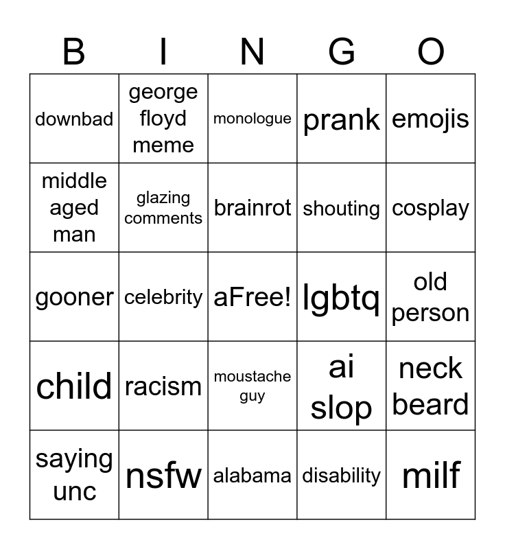 This bingo card has a free space and 24 words: racism, nsfw, brainrot, saying unc, emojis, downbad, middle aged man, george floyd meme, lgbtq, moustache guy, shouting, gooner, ai slop, neck beard, glazing comments, disability, old person, monologue, cosplay, celebrity, milf, child, prank and alabama.