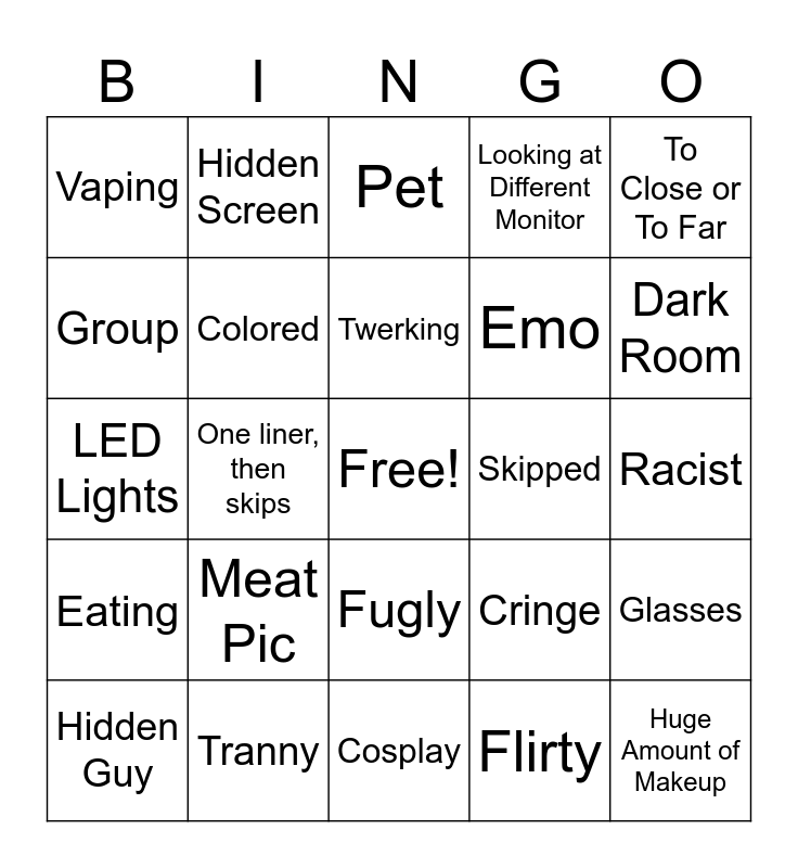 This bingo card has a free space and 24 words: Meat Pic, Tranny, Twerking, Hidden Guy, To Close or To Far, Vaping, Group, Hidden Screen, Skipped, Fugly, Emo, LED Lights, Cringe, Glasses, Colored, Flirty, Racist, Pet, Dark Room, One liner, then skips, Huge Amount of Makeup, Eating, Looking at Different Monitor and Cosplay.