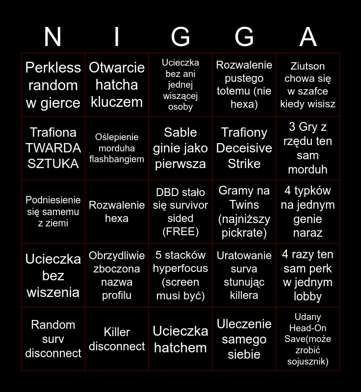 This bingo card has a free space and 36 words: Cheater w gierce, Ucieczka z chwytu morduha, Pierdolnięcie morduha paletą, Oślepienie morduha flashbangiem, Uratowanie surva stunując killera, Ucieczka bez wiszenia, Sable ginie jako pierwsza, Krzyczący rudy cwel, Ziutson chowa się w szafce kiedy wisisz, Otwarcie skrzyni w piwnicy, Rozwalenie hexa, Rozwalenie pustego totemu (nie hexa), Rozbrojenie pułapki killera, Gramy na Twins (najniższy pickrate), 3 Gry z rzędu ten sam morduh, Perkless random w gierce, Uratowanie survivora w wyniku sabotażu, Obrzydliwie zboczona nazwa profilu, Udany Head-On Save(może zrobić sojusznik), Ucieczka bez ani jednej wiszącej osoby, 4 typków na jednym genie naraz, 4 razy ten sam perk w jednym lobby, Killer disconnect, Random surv disconnect, Ucieczka hatchem, Otwarcie hatcha kluczem, Podniesienie się samemu z ziemi, Ściągnięcie się samemu z haka, Trafiony Deceisive Strike, Trafiona TWARDA SZTUKA, Wykrwawienie się na ziemi, Wykrwawienie żółtego paska, Uleczenie samego siebie, 5 stacków hyperfocus (screen musi być), Stealth killer kiedy masz perk na terror and Random gracz robi adepta.