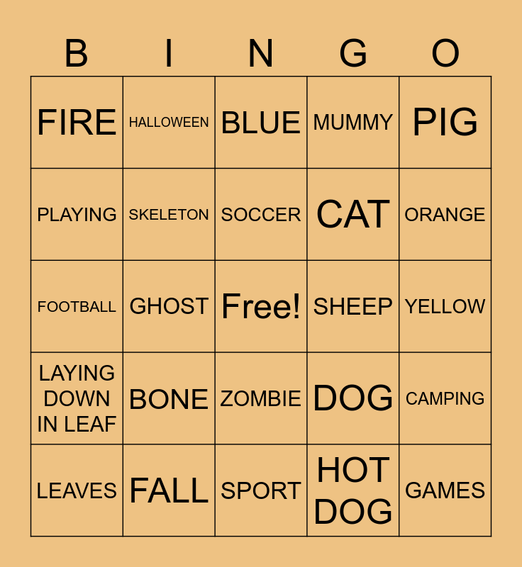 This bingo card has a free space and 24 words: BONE, FALL, SOCCER, LEAVES, PIG, FIRE, PLAYING, HALLOWEEN, SHEEP, ZOMBIE, CAT, FOOTBALL, DOG, CAMPING, SKELETON, HOT DOG, YELLOW, BLUE, ORANGE, GHOST, GAMES, LAYING DOWN IN LEAF, MUMMY and SPORT.