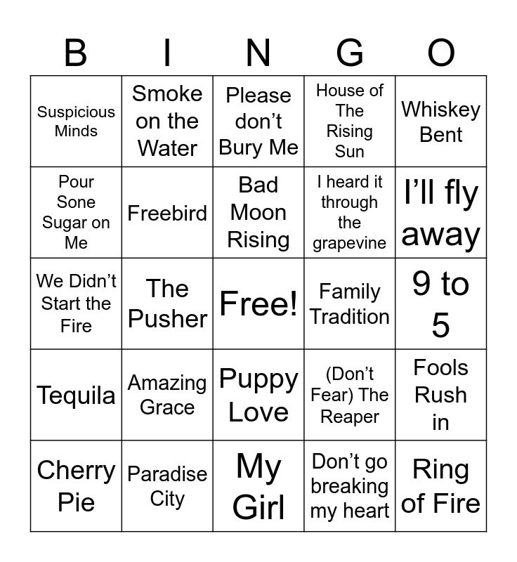 This bingo card has a free space and 29 words: Cherry Pie, Dark end of the Street, The Pusher, Diggin up bones, Suspicious Minds, Please don’t Bury Me, Freebird, Amazing Grace, Family Tradition, Paradise City, 9 to 5, Ring of Fire, My Girl, Don’t go breaking my heart, I’ll fly away, Sweet Caroline, Puppy Love, Tequila, Whiskey Bent, We Didn’t Start the Fire, (Don’t Fear) The Reaper, Walking the floors over you, I heard it through the grapevine, Pour Sone Sugar on Me, House of The Rising Sun, Smoke on the Water, Fools Rush in, Bad Moon Rising and A County Boy Can Survive.