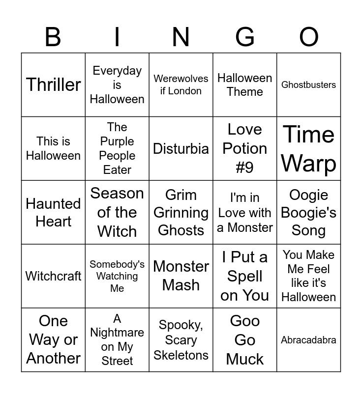 This bingo card has 25 words: Somebody's Watching Me, Spooky, Scary Skeletons, Disturbia, One Way or Another, Ghostbusters, Thriller, This is Halloween, Everyday is Halloween, I'm in Love with a Monster, Monster Mash, Love Potion #9, Haunted Heart, I Put a Spell on You, You Make Me Feel like it's Halloween, The Purple People Eater, Abracadabra, Oogie Boogie's Song, Werewolves if London, Time Warp, Season of the Witch, Grim Grinning Ghosts, A Nightmare on My Street, Witchcraft, Halloween Theme and Goo Go Muck.