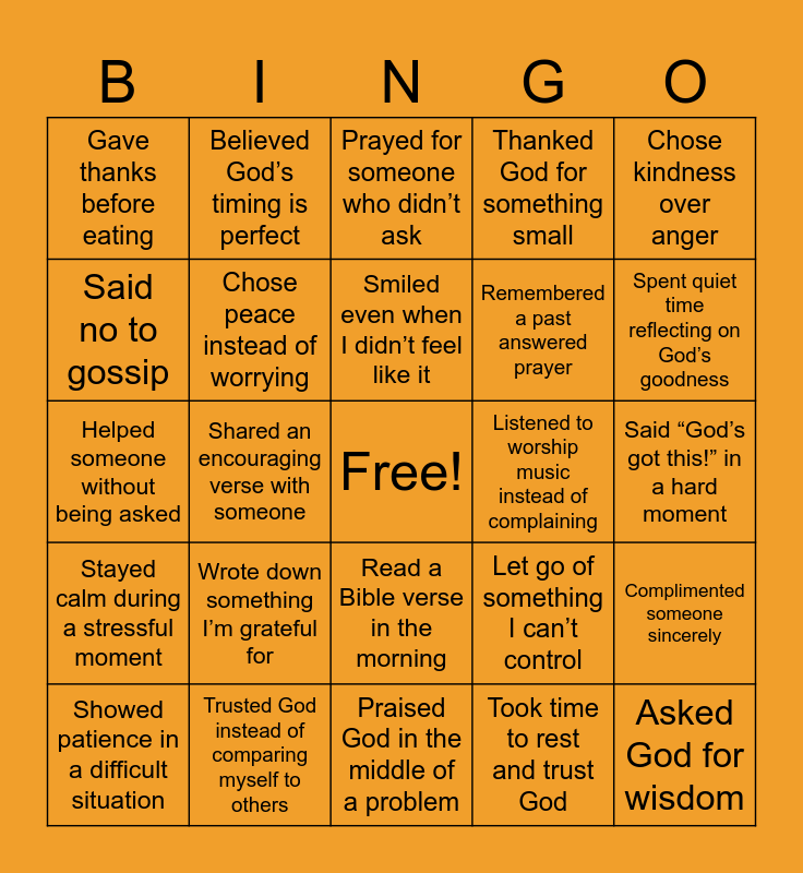 This bingo card has a free space and 35 words: Trusted God with a delay, Prayed before making a decision, Encouraged someone who was sad, Chose peace instead of worrying, Read a Bible verse in the morning, Thanked God for something small, Said no to gossip, Forgave someone who hurt me, Smiled even when I didn’t feel like it, Talked about my faith with a friend, Helped someone without being asked, Chose kindness over anger, Believed God would provide, Wrote down a prayer request, Gave thanks before eating, Listened to worship music instead of complaining, Took time to rest and trust God, Shared an encouraging verse with someone, Stayed calm during a stressful moment, Asked God for wisdom, Let go of something I can’t control, Showed patience in a difficult situation, Complimented someone sincerely, Trusted God instead of comparing myself to others, Prayed for someone who didn’t ask, Spent quiet time reflecting on God’s goodness, Thanked God before going to sleep, Chose honesty even when it was hard, Remembered a past answered prayer, Said “God’s got this!” in a hard moment, Walked away from a negative conversation, Praised God in the middle of a problem, Wrote down something I’m grateful for, Believed God’s timing is perfect and Invited someone to church or devotion.