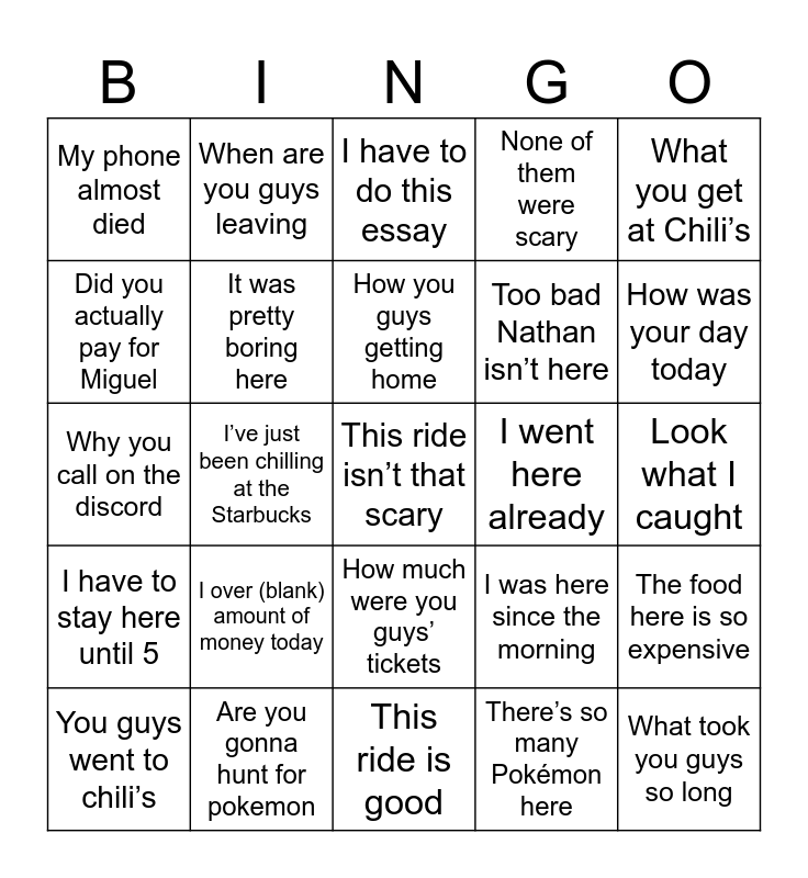 This bingo card has a free space and 24 words: I over (blank) amount of money today, Are you gonna hunt for pokemon, How you guys getting home, You guys went to chili’s, What you get at Chili’s, My phone almost died, Did you actually pay for Miguel, When are you guys leaving, I went here already, How much were you guys’ tickets, Too bad Nathan isn’t here, Why you call on the discord, I was here since the morning, The food here is so expensive, It was pretty boring here, There’s so many Pokémon here, Look what I caught, I have to do this essay, How was your day today, I’ve just been chilling at the Starbucks, What took you guys so long, I have to stay here until 5, None of them were scary and This ride is good.