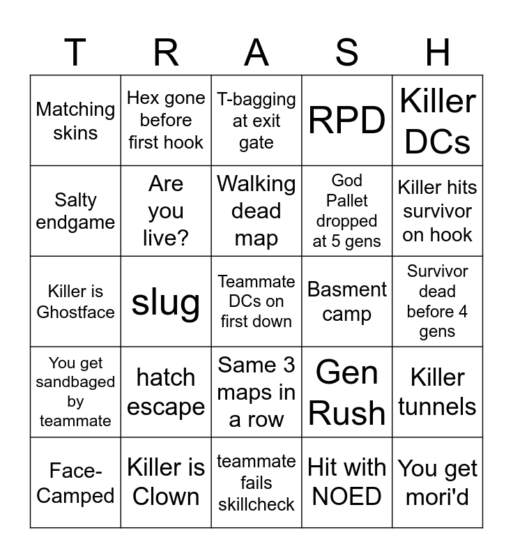 This bingo card has a free space and 24 words: hatch escape, Killer is Clown, Walking dead map, Face-Camped, Killer DCs, Matching skins, Salty endgame, Hex gone before first hook, Basment camp, Same 3 maps in a row, God Pallet dropped at 5 gens, Killer is Ghostface, Gen Rush, Killer tunnels, Are you live?, Hit with NOED, Survivor dead before 4 gens, T-bagging at exit gate, Killer hits survivor on hook, slug, You get mori'd, You get sandbaged by teammate, RPD and teammate fails skillcheck.