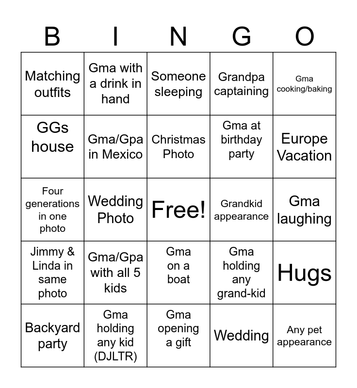 This bingo card has a free space and 36 words: Boating, Debbie & Theresa in same photo, Bal Harbour Club, Gma/Gpa in Mexico, Gma holding any grand-kid, Jimmy & Linda in same photo, Christmas Photo, Gma driving, Gma cooking/baking, Fishing, Wedding Photo, Grandpa captaining, On the beach, Grandkid appearance, Europe Vacation, Matching outfits, Family dinner, Gma/Gpa with all 5 kids, Any pet appearance, Someone sleeping, Gma laughing, Hugs, Gma holding any kid (DJLTR), Backyard party, Gma opening a gift, Gma with a drink in hand, Four generations in one photo, Big Rick + Mustache, Gma at birthday party, GGs house, GG appearance, Forbes family appearance, Wedding, Gma on a boat, “La Douche” and Mount Prospect house.