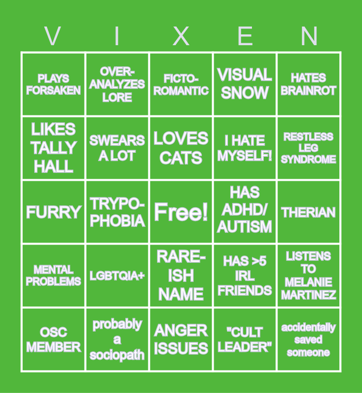 This bingo card has a free space and 24 words: OSC MEMBER, LGBTQIA+, LOVES CATS, "CULT LEADER", HATES BRAINROT, PLAYS FORSAKEN, OVER-ANALYZES LORE, FICTO- ROMANTIC, HAS ADHD/ AUTISM, THERIAN, FURRY, SWEARS A LOT, HAS >5 IRL FRIENDS, LISTENS TO MELANIE MARTINEZ, LIKES TALLY HALL, probably a sociopath, ANGER ISSUES, VISUAL SNOW, RESTLESS LEG SYNDROME, MENTAL PROBLEMS, TRYPO-PHOBIA, RARE-ISH NAME, I HATE MYSELF! and accidentally saved someone.
