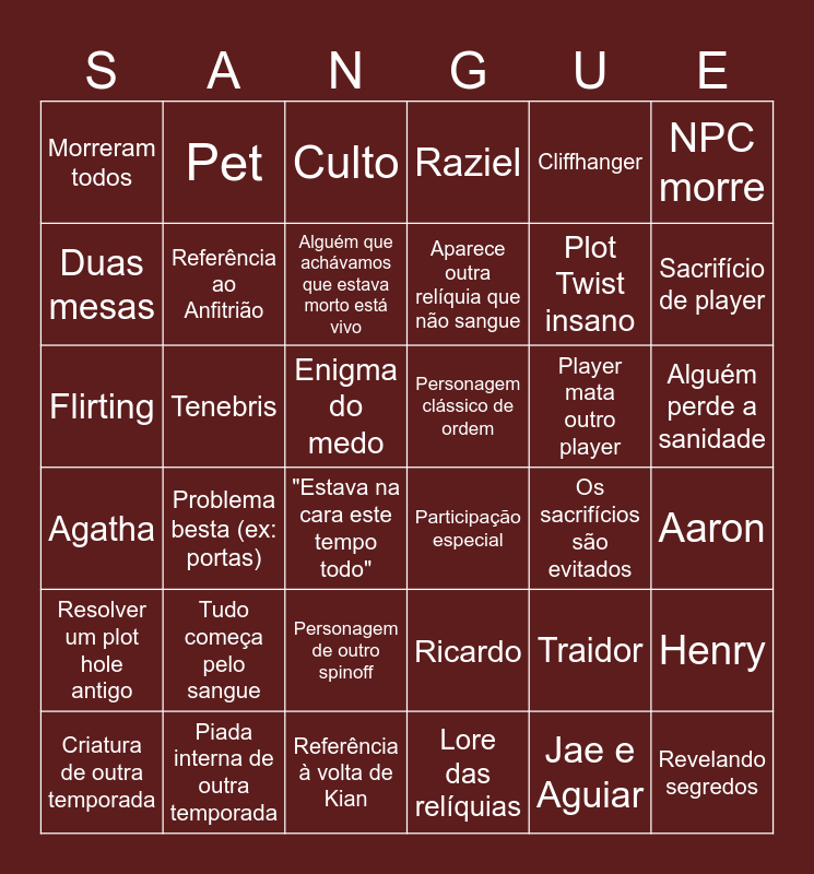 This bingo card has 36 words: Ricardo, Personagem de outro spinoff, Lore das relíquias, Duas mesas, Agatha, Personagem clássico de ordem, Referência ao Anfitrião, Referência à volta de Kian, Cliffhanger, Traidor, Sacrifício de player, Raziel, Henry, Tenebris, Aparece outra relíquia que não sangue, Morreram todos, Resolver um plot hole antigo, Player mata outro player, Flirting, Culto, Enigma do medo, Problema besta (ex: portas), Participação especial, "Estava na cara este tempo todo", Os sacrifícios são evitados, Pet, Plot Twist insano, Piada interna de outra temporada, Alguém que achávamos que estava morto está vivo, NPC morre, Revelando segredos, Criatura de outra temporada, Aaron, Alguém perde a sanidade, Tudo começa pelo sangue and Jae e Aguiar.