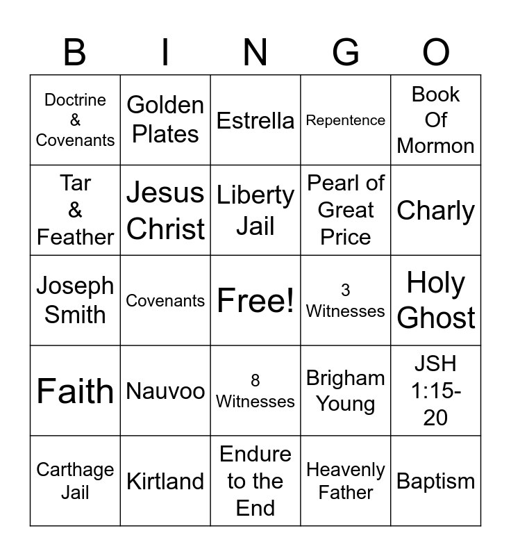 This bingo card has a free space and 24 words: Nauvoo, Kirtland, Liberty Jail, Carthage Jail, Book Of Mormon, Doctrine & Covenants, Tar & Feather, Golden Plates, 3 Witnesses, 8 Witnesses, Pearl of Great Price, Joseph Smith, Brigham Young, JSH 1:15-20, Jesus Christ, Heavenly Father, Holy Ghost, Estrella, Charly, Covenants, Baptism, Faith, Repentence and Endure to the End.