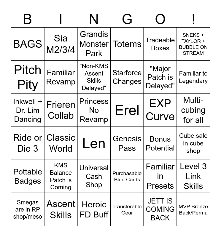 This bingo card has 36 words: Purchasable Blue Cards, Universal Cash Shop, Transferable Gear, Pitch Pity, Ride or Die 3, Erel, Familiar Revamp, Heroic FD Buff, Tradeable Boxes, Familiar in Presets, Familiar to Legendary, Totems, Level 3 Link Skills, Frieren Collab, Starforce Changes, BAGS, Pottable Badges, EXP Curve, Inkwell + Dr. Lim Dancing, Grandis Monster Park, Princess No Revamp, Classic World, Genesis Pass, Len, Bonus Potential, Sia M2/3/4, "Major Patch is Delayed", Ascent Skills, "Non-KMS Ascent Skills Delayed", SNEKS + TAYLOR + BUBBLE ON STREAM, MVP Bronze Back/Perma, Smegas are in RP shop/meso, Cube sale in cube shop, Multi-cubing for all, KMS Balance Patch is Coming and JETT IS COMING BACK.
