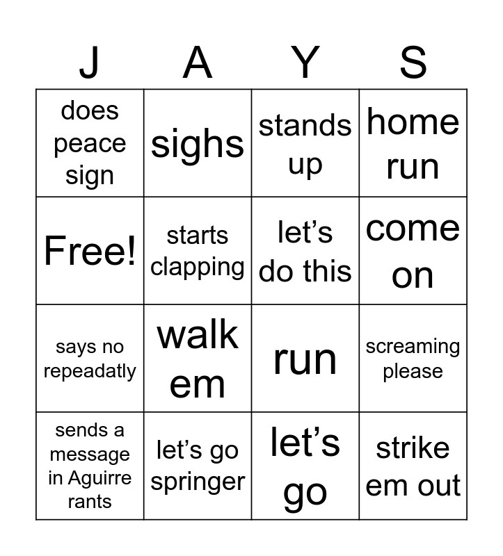 This bingo card has 16 words: let’s go springer, screaming please, stands up, does peace sign, says no repeadatly, sighs, run, let’s go, Free!, starts clapping, sends a message in Aguirre rants, home run, walk em, come on, let’s do this and strike em out.