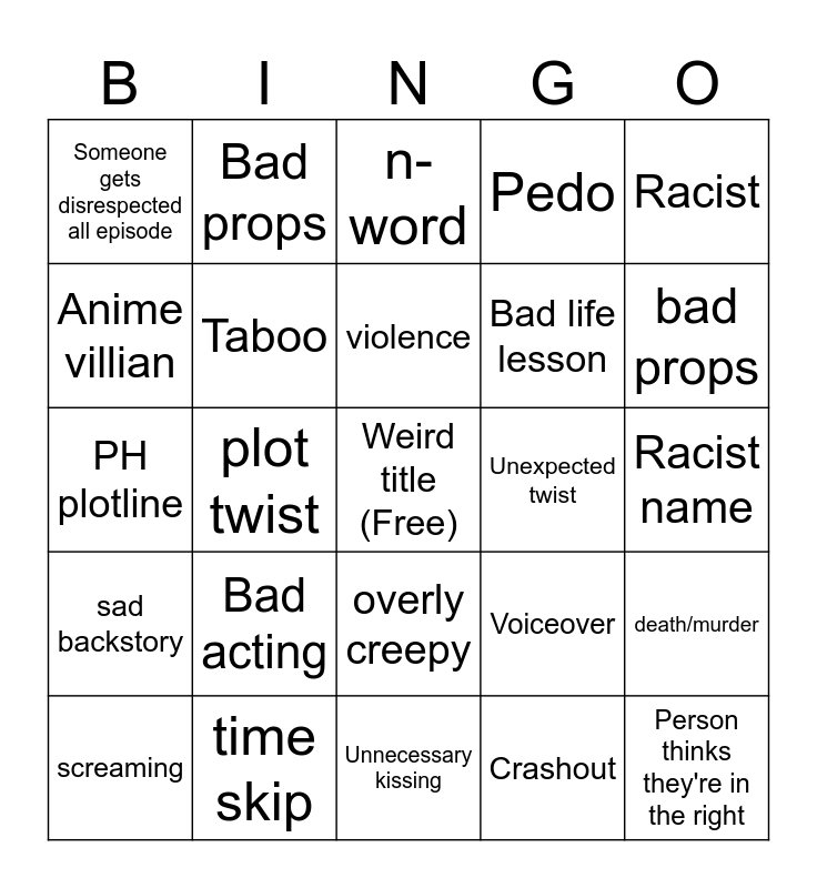 This bingo card has a free space and 24 words: Bad acting, time skip, violence, screaming, Racist, Someone gets disrespected all episode, Anime villian, Bad props, Unexpected twist, overly creepy, Bad life lesson, PH plotline, Voiceover, death/murder, Taboo, Crashout, Racist name, n-word, bad props, plot twist, Person thinks they're in the right, sad backstory, Pedo and Unnecessary kissing.