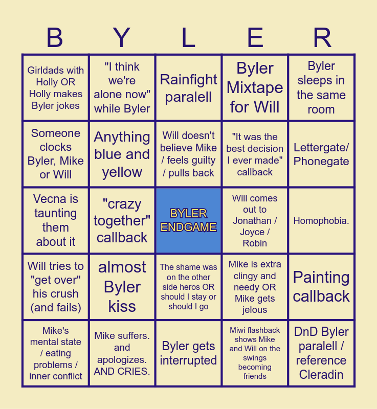 This bingo card has a free space and 24 words: almost Byler kiss, Mike suffers. and apologizes. AND CRIES., Will doesn't believe Mike / feels guilty / pulls back, Mike's mental state / eating problems / inner conflict, Byler sleeps in the same room, Girldads with Holly OR Holly makes Byler jokes, Someone clocks Byler, Mike or Will, "I think we're alone now" while Byler, Will comes out to Jonathan / Joyce / Robin, The shame was on the other side heros OR should I stay or should I go, "It was the best decision I ever made" callback, Vecna is taunting them about it, Mike is extra clingy and needy OR Mike gets jelous, Painting callback, Anything blue and yellow, Miwi flashback shows Mike and Will on the swings becoming friends, Homophobia., Rainfight paralell, Lettergate/ Phonegate, "crazy together" callback, DnD Byler paralell / reference Cleradin, Will tries to "get over" his crush (and fails), Byler Mixtape for Will and Byler gets interrupted.