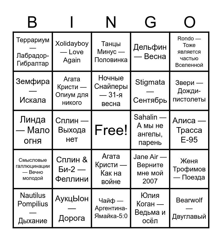 This bingo card has a free space and 96 words: Nautilus Pompilius — Матерь богов, Смысловые галлюцинации — Розовые очки, Александр Пушной — От винта!, Sahalin — А мы не ангелы, парень, Найк Борзов — Верхом на звезде, Альянс — На заре, КняZz — Пиво, пиво, пиво, Сплин — Романс, Город 312 — Обернись, Ленинград — Мамба, Братья Грим — Ресницы, Кино — Перемен, Би-2 — Полковнику никто не пишет, Звери — Дожди-пистолеты, Чиж & Co — О любви, Земфира — Искала, Ночные Снайперы — 31-я весна, Анимация — Родина, Вячеслав Бутусов — Песня идущего домой, Моральный кодекс — Первый снег, Високосный год — Тихий огонёк, 7Б — Молодые ветра, Несчастный случай — Генералы, Маша и Медведи — Любочка, Агата Кристи — Как на войне, Чайф — Аргентина-Ямайка-5:0, Tokio — Кто я без тебя, Террариум — Лабрадор-Гибралтар, Animal ДжаZ — Три полоски, Жуки — Батарейка, Nautilus Pompilius — Крылья, Jane Air — Верните мне мой 2007, Земфира — До свидания…, Мумий Тролль — Фантастика, Rondo — Тоже является частью Вселенной, Звери — Просто такая сильная любовь, Женя Трофимов — Поезда, Ночные Снайперы — Катастрофически, Кино — Звезда по имени Солнце, Сплин — Выхода нет, Кино — Группа крови, Nautilus Pompilius — Дыхание, Bearwolf — Двуглавый, АукцЫон — Дорога, Смысловые галлюцинации — Вечно молодой, Танцы Минус — Половинка, ДДТ — Просвистела, Гражданская Оборона — Всё идёт по плану, Егор Летов — Моя оборона, Сектор Газа — Бомж, Мукка — Девочка с каре, Сплин — Орбит без сахара, Ляпис Трубецкой — Капитал, Ария — Беспечный ангел, Вячеслав Бутусов — Девушка по городу, Гречка — Люби меня люби, ДДТ — Это всё…, Звери — Всё, что касается, Земфира — Ариведерчи, Кипелов — Я свободен, Король и Шут — Лесник, Король и Шут — Мёртвый анархист, Линда — Ворона, Ляпис Трубецкой — В платье белом, Нервы — Кофе мой друг, Порнофильмы — Я так соскучился, Пилот — Шнурок, Чичерина — Ту-лу-ла, Ундервуд — Гагарин, я вас любила, Юлия Коган — Ведьма и осёл, Gorky Park — Moscow Calling, Машина Времени — Однажды мир прогнётся под нас, Алиса — Небо славян, Андрей Макаревич — Перекрёсток, Слот — Клон, Йорш — 2007, Ленинград — Мне бы в небо, Агата Кристи — Опиум для никого, Lumen — Sid & Nancy, Stigmata — Сентябрь, Дельфин — Весна, t.A.T.u. — Нас не догонят, Браво — Дорога в облака, Секрет — Привет, Ноль — Человек и кошка, Линда — Мало огня, Сплин & Би-2 — Феллини, Мумий Тролль — Утекай, Мёртвые Дельфины — На моей луне, Алиса — Трасса Е-95, Братья Грим — Кустурица, Город 312 — Фонари, Танцы Минус — Цветут цветы, Total — Бьёт по глазам, Xolidayboy — Love Again and The Hatters — Да, со мной непросто.