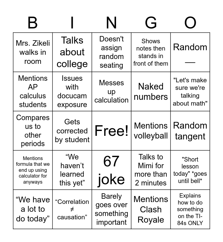 This bingo card has a free space and 24 words: “We haven’t learned this yet”, “Correlation ≠ causation”, Messes up calculation, “We have a lot to do today”, Random __, Mrs. Zikeli walks in room, Mentions AP calculus students, Talks about college, Mentions volleyball, 67 joke, Naked numbers, Compares us to other periods, Talks to Mimi for more than 2 minutes, "Short lesson today" *goes until bell*, Issues with docucam exposure, Mentions Clash Royale, Random tangent, Doesn't assign random seating, "Let's make sure we're talking about math", Gets corrected by student, Explains how to do something on the TI-84s ONLY, Mentions formula that we end up using calculator for anyways, Shows notes then stands in front of them and Barely goes over something important.