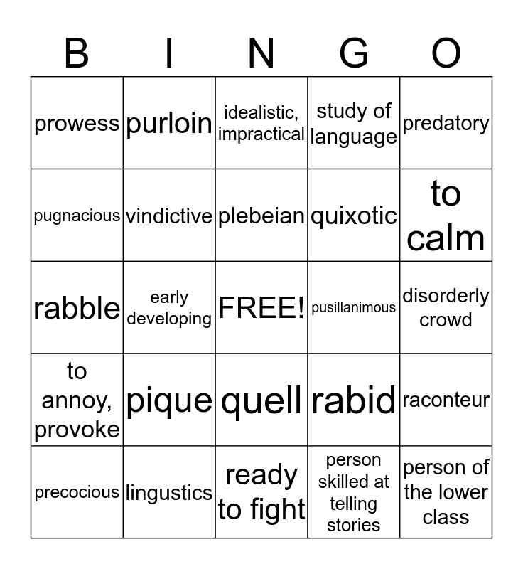 This bingo card has a free space and 24 words: pique, lingustics, plebeian, precocious, predatory, prowess, pugnacious, purloin, pusillanimous, quell, quixotic, rabble, rabid, raconteur, vindictive, person skilled at telling stories, disorderly crowd, idealistic, impractical, to calm, early developing, person of the lower class, to annoy, provoke, study of language and ready to fight.