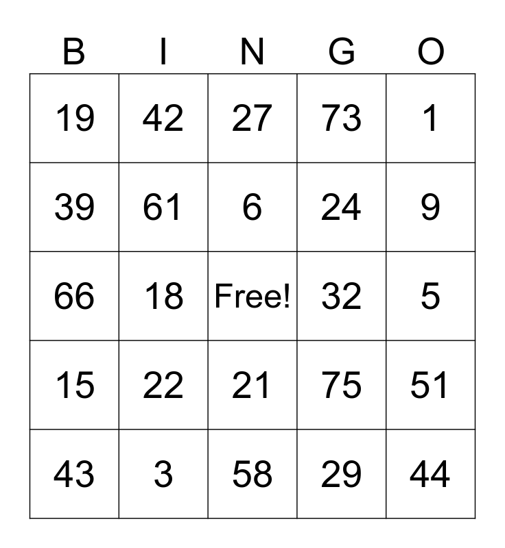 This bingo card has a free space and 24 words: 22, 3, 6, 43, 1, 19, 39, 42, 32, 21, 24, 66, 75, 51, 61, 29, 5, 27, 9, 18, 44, 15, 73 and 58.