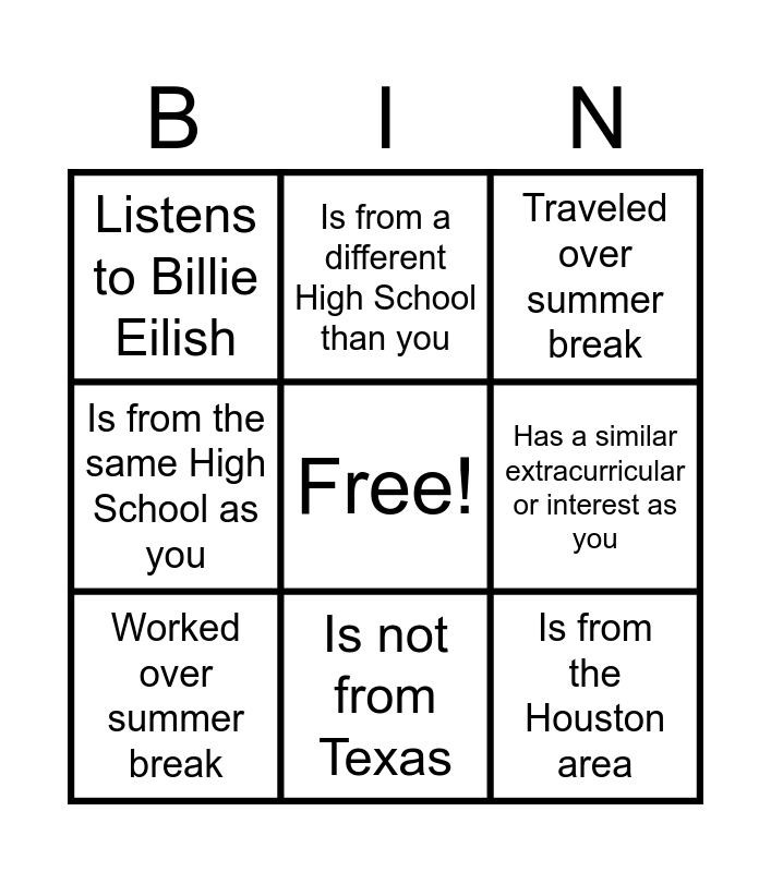 This bingo card has a free space and 8 words: Is from the same High School as you, Is from a different High School than you, Has a similar extracurricular or interest as you, Worked over summer break, Traveled over summer break, Listens to Billie Eilish, Is not from Texas and Is from the Houston area.