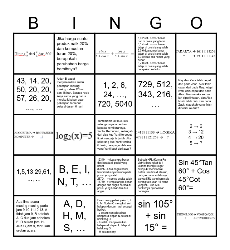 This bingo card has 7 images and 18 words: B, E, I, N, T, …, Enam orang pelari, yakni J, K, L, M, N, dan O mengikuti seri balapan dengan hasil sebagai berikut: - J selalu menyelesaikan balapan di depan N, tetapi di belakang O. - K selalu menyelesaikan balapan di depan L, tetapi di belakang O. - M selalu meny, 1, 2, 6, 24, …, 720, 5040, Ada lima acara masing-masing pada jam 9,10,11,12,13. A tidak jam 9, B setelah A, C dua jam sebelum E, D bukan jam 11. Jika C jam 9, tentukan urutan acara., 43, 14, 20, 50, 20, 20, 57, 26, 20, ..., ..., Jika harga suatu produk naik 20% dan kemudian turun 20%, berapakah perubahan harga bersihnya?, 12340 --> dua angka benar dan berada di posisi yang benar 82065 -->dua angka benar, tetapi keduanya berada pada posisi yang salah 28704 --> semua angka salah 16759 --> empat angka benar dengan dua angka berada di posisi yang benar dan dua angka, 729, 512, 343, 216, …, Sebuah KRL (Kereta Rel Listrik) berangkat dari Jakarta menuju Bogor setiap 40 menit sekali. Ketika Lisa tiba di stasiun, petugas memberitahunya bahwa KRL yang baru saja berangkat sudah 15 menit yang lalu. Jika KRL berikutnya dijadwalkan berangka, Sin 45°Tan 60° + Cos 45°Cot 60°=, A dan B dapat menyelesaikan suatu pekerjaan masing-masing dalam 12 hari dan 18 hari. Berapa rasio kerja sama yang harus mereka lakukan agar pekerjaan tersebut selesai dalam 6 hari, 2 → 6 3 → 12 4 → 20 5 → ?, Ray dan Zack lebih cepat dari pada Joan. Alex lebih cepat dari pada Ray, tetapi Ivan lebih cepat dari pada Alex. Jika mereka semua lari diperlintasan, dan Alex finish lebih dulu dari pada Zack, siapakah yang finish diposisi ke dua?, Yanti membuat kue, lalu setengahnya ia berikan kepada kembarannya, Yanto. Kemudian, setengah dari sisa kue Yanti tersebut tidak sengaja terjatuh. Jika sekarang kue Yanti tersisa 6 buah, berapa jumlah kue yang Yanti buat dari awal?, A, D, H, M, S, …, 1,5,13,29,61, ..., ..., 6,8,2 satu nomor benar dan di posisi yang tepat 6,1,4 satu nomor benar tetapi di posisi yang salah 2,0,6 dua nomor benar tetapi di posisi yang salah 7,3,8 tidak ada nomor yang benar 8,7,0 satu nomor benar tetapi di posisi yang salah berapakah kode ku and sin 105° + sin 15° =.