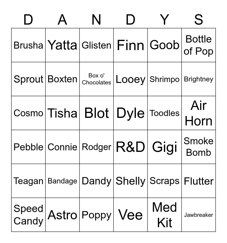 This bingo card has 36 words: Shelly, Dandy, Vee, Sprout, Pebble, Dyle, Boxten, Poppy, Goob, Scraps, Brightney, Finn, Flutter, Tisha, Looey, Brusha, Teagan, Toodles, Cosmo, Glisten, Blot, Connie, R&D, Rodger, Gigi, Yatta, Shrimpo, Astro, Box o' Chocolates, Bottle of Pop, Jawbreaker, Speed Candy, Smoke Bomb, Air Horn, Bandage and Med Kit.