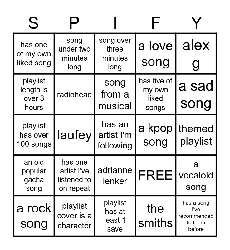 This bingo card has 25 words: has one artist I've listened to on repeat, playlist has at least 1 save, song from a musical, a rock song, alex g, has one of my own liked song, playlist length is over 3 hours, song under two minutes long, a kpop song, adrianne lenker, has five of my own liked songs, playlist has over 100 songs, FREE, a vocaloid song, radiohead, has a song I've recommended to them before, themed playlist, song over three minutes long, a sad song, laufey, has an artist I'm following, playlist cover is a character, an old popular gacha song, a love song and the smiths.