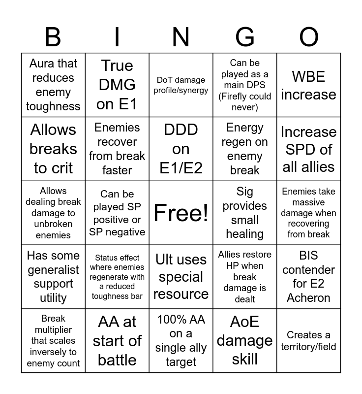 This bingo card has a free space and 24 words: Status effect where enemies regenerate with a reduced toughness bar, AA at start of battle, DDD on E1/E2, Break multiplier that scales inversely to enemy count, WBE increase, Aura that reduces enemy toughness, Allows breaks to crit, True DMG on E1, Sig provides small healing, Ult uses special resource, Energy regen on enemy break, Allows dealing break damage to unbroken enemies, Allies restore HP when break damage is dealt, BIS contender for E2 Acheron, Enemies recover from break faster, AoE damage skill, Enemies take massive damage when recovering from break, DoT damage profile/synergy, Increase SPD of all allies, Can be played SP positive or SP negative, Creates a territory/field, Has some generalist support utility, Can be played as a main DPS (Firefly could never) and 100% AA on a single ally target.