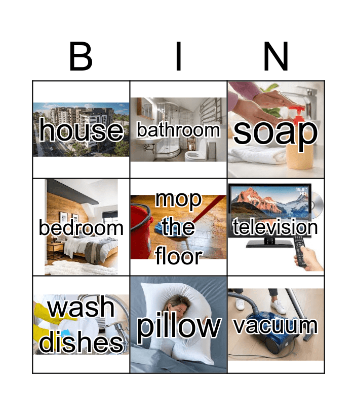 This bingo card has 14 images, a free space and 14 words: kitchen, living room, wash dishes, bathroom, bedroom, vacuum, do laundry, cook, pillow, house, put out the trash, television, soap and clock.