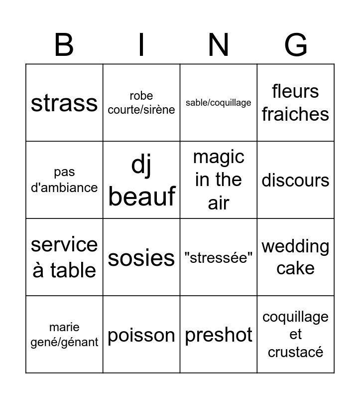 This bingo card has 16 words: poisson, wedding cake, sable/coquillage, strass, service à table, robe courte/sirène, "stressée", preshot, pas d'ambiance, dj beauf, marie gené/génant, fleurs fraiches, sosies, discours, magic in the air and coquillage et crustacé.