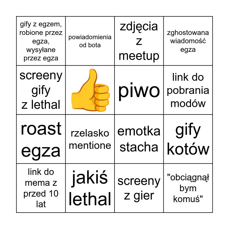 This bingo card has 1 images and 15 words: jakiś lethal, gify kotów, zdjęcia z meetup, gify z egzem, robione przez egza, wysyłane przez egza, roast egza, powiadomienia od bota, emotka stacha, screeny z gier, screeny gify z lethal, link do mema z przed 10 lat, zghostowana wiadomość egza, rzelasko mentione, link do pobrania modów, piwo and "obciągnął bym komuś".