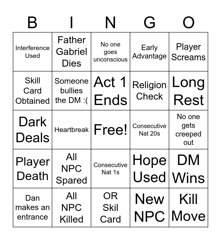 This bingo card has a free space and 24 words: All NPC Spared, All NPC Killed, Act 1 Ends, Dan makes an entrance, Player Screams, Interference Used, Skill Card Obtained, Father Gabriel Dies, Consecutive Nat 20s, Consecutive Nat 1s, Religion Check, Dark Deals, Hope Used, DM Wins, Someone bullies the DM :(, New NPC, No one gets creeped out, No one goes unconscious, Long Rest, Heartbreak, Kill Move, Player Death, Early Advantage and OR Skil Card.